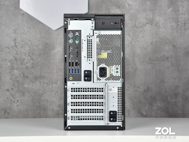 T40 背部的插孔集中在了面板左上部,从上到下,从左到右分别为 PS2 接口(键盘)、PS2 接口(鼠标)、串行接口、DisplayPort x2、USB2.0 Type-A x2(支持智能开机)、NIC 接口、USB3.0 Type-A 接口 x4、音频输出接口,背部面板中间和右下角是 PSU 部件释放闩锁,右上角为电源设备,包括自检按钮、自检 LED、电源连接器接口等部件。