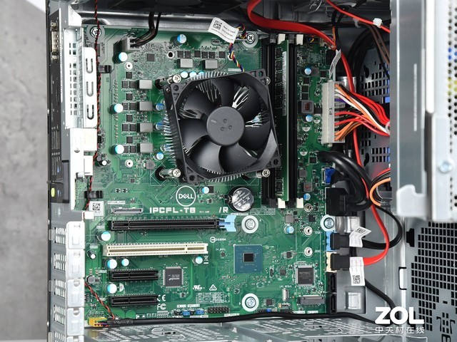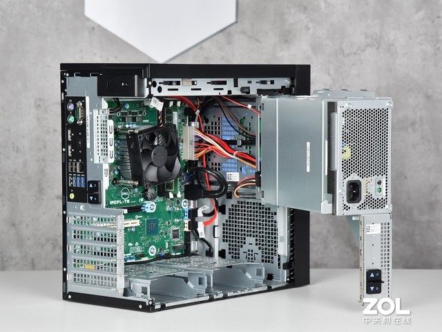 打开机箱侧盖,可以看到 T40 内部采用了模块化设计,有一个位于系统顶部的系统冷却风扇和一个位于散热器上的处理器冷却风扇;主板拥有4个 PCIe 插槽,较多支持多达三个 PCI express(PCIe) 3.0 和一个 PCI 卡。总得来看,PowerEdgeT40 的设计还是十分中规中矩的,噪音方面则满足了静音需求,在整个评测过程中都没有噪音明显的情况,而且 PCIe 的支持也适合中小企业选用。