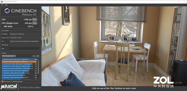 使用 CineBenchR20 测试服务器性能,单核得分459,多核得分1780。