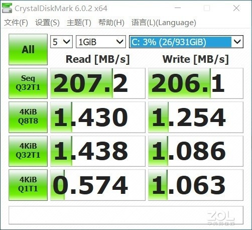 接下来使用 CrystalDiskMark 测试硬盘的读写能力,包括连续读写、4KBQ8T8 随机读写测试、队列深度(Queue Depth)为32的情况下的 4K 随机性能和 4KB 数据包随机读写性能。队列深度描述的是硬盘能够同时激活的较大 IO 值,队列深度越大,实际性能也会越高。可以看到 T40 配备的硬盘读取速度为 207.2MB/S,写入速度为 206.1MB/S,这个速度已经相当快了。