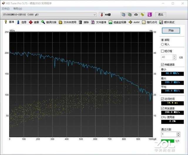 然后草莓下载APP下载再使用 HD Tune Pro 硬盘检测工具进行 1TB 读取速度测试,较低 86.8MB/S,较高 205.7MB/S,平均速度 165.6MB/S。