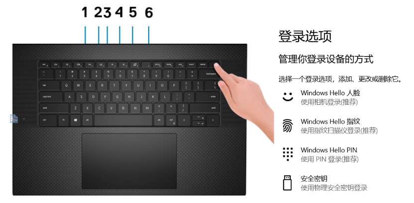 5750的屏幕上方集成了近程传感器和环境光传感器以及RGB+IR 摄像头和2颗IR LED及LED 指示灯,键盘将开机键和指纹传感器整合在一起,配合戴尔的掀盖开机功能,加上win10支持的人脸识别和指纹登录,使得进入系统的方式非常迅速,可以让你快速的进行工作,近程传感器在你离开时会自动锁定,感应到你时会迅速解锁,既保证了安全又会让你快速投入工作,环境光传感器还可以自己调整屏幕的亮度,摄像头支持1280 *720 (HD) at 30 fps,摄像头在使用时LED指示会亮起。