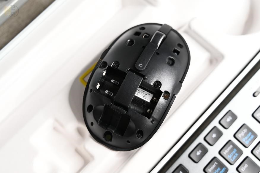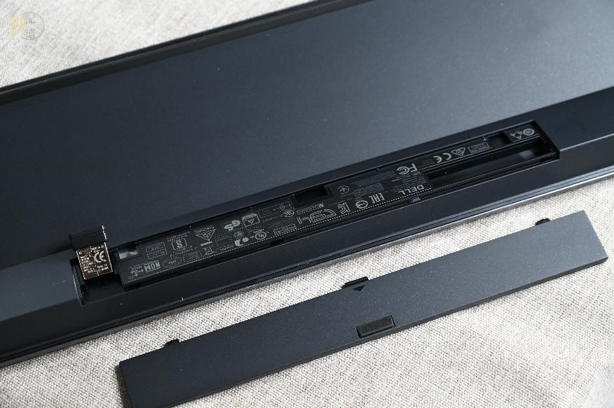 键鼠使用之前需要先安装好电池,戴尔在电池仓这部分的设计做得不错,其中键盘的电池仓位于底部,利用了支脚的空间,开合比较流畅,还预留了一个接收器的收纳仓,如果主要用蓝牙连接的话,接收器可以储存在这里,避免要用的时候找不到。另外戴尔还把各种标准、规格、检测合格的图标放在了电池仓上,提高了键盘表面的整洁度。
