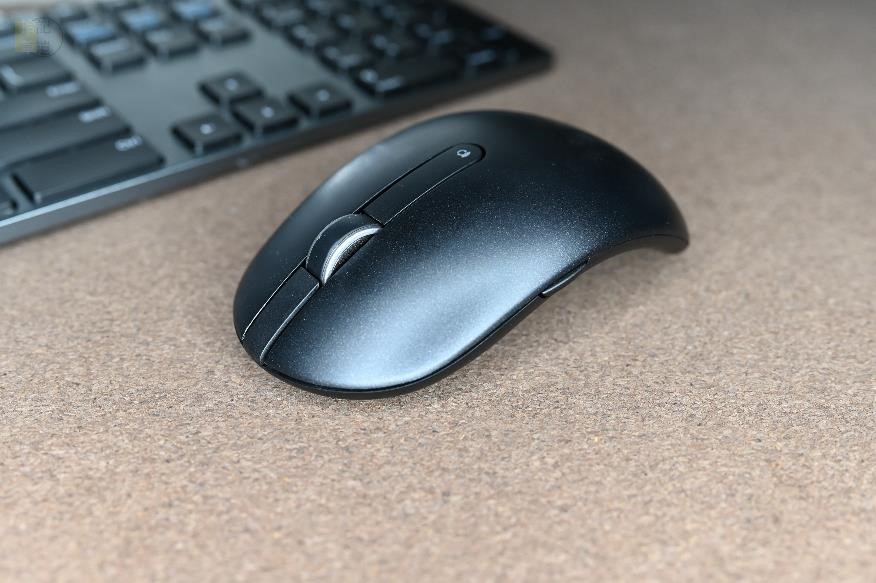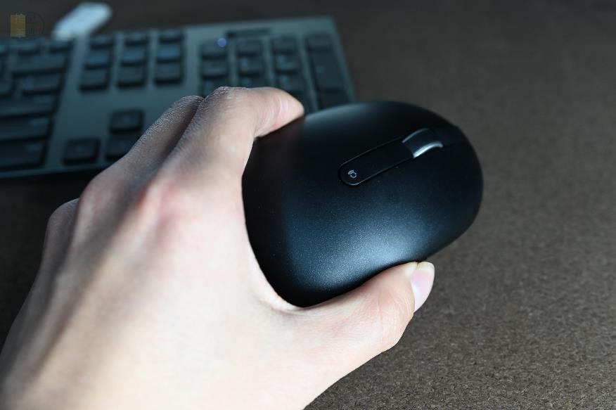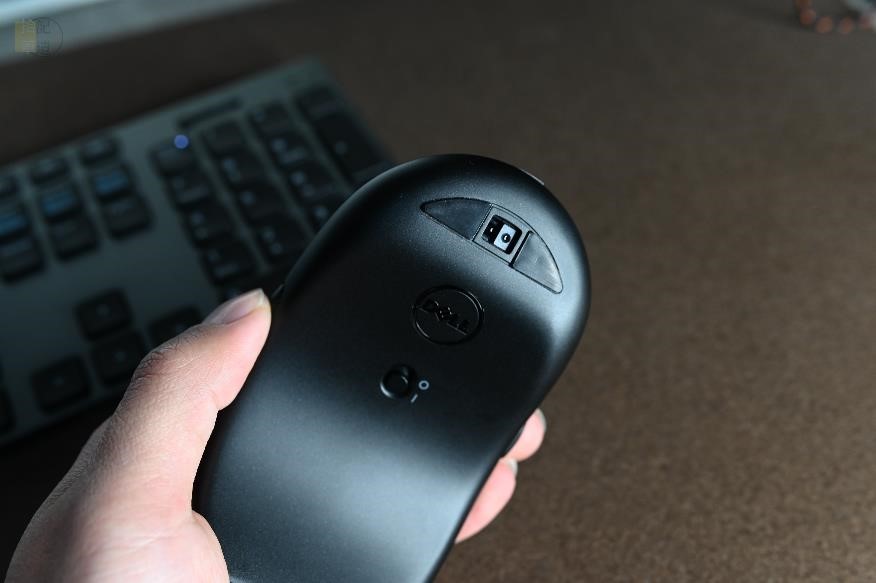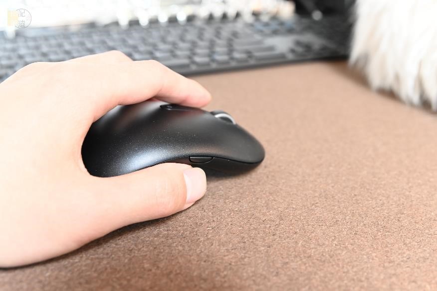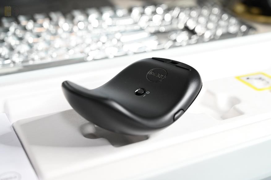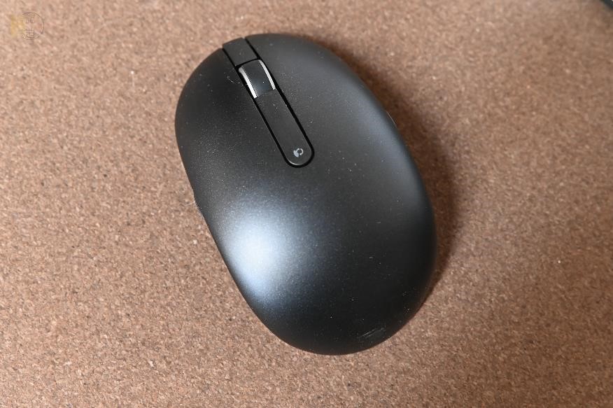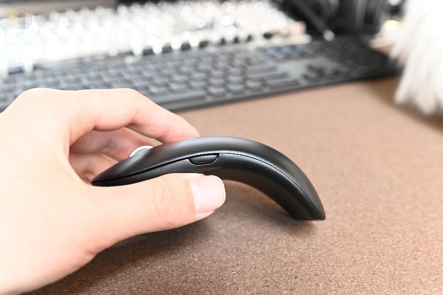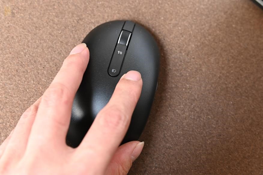 在鼠标的正面,双键并没有明显的界限,点击时很灵活,敲击声很清脆,即使到了鼠标的中部,依然可以灵活地敲击左右键。同时在鼠标的中间,除了滚轮之外,还有一枚设备切换键,外加一个隐藏式的OLED屏,在切换和连接新设备时会很直观,体现出了一定的智能化属性。