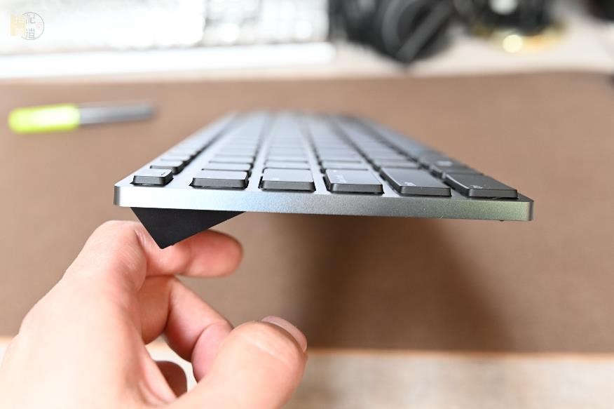 这款键盘的倾斜角度是固定的,约为10°左右,键盘一侧没有曲面设计,按键则有轻微的内凹。KM717键盘的底壳是一体式的结构,表面没有螺丝,刨去底部的支架高度,底壳的厚度为5mm左右,按键高度不到1.5mm,在同类产品当中属轻薄型,能够媲美笔记本键盘的厚度。