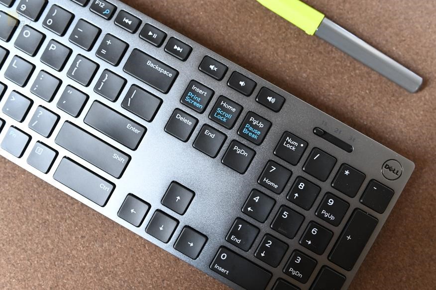 最右侧的小键盘设计比较简单,没有什么变化,其顶部是一个三段式拨动开关,可以在2.4G以及两台蓝牙连接的设备中进行切换。一般小键盘上方是键盘状态灯的位置,在KM717上面被用作设备切换键之后,常用的小键盘状态灯和大写锁定灯被放在了按键上面,日常使用也很直观。